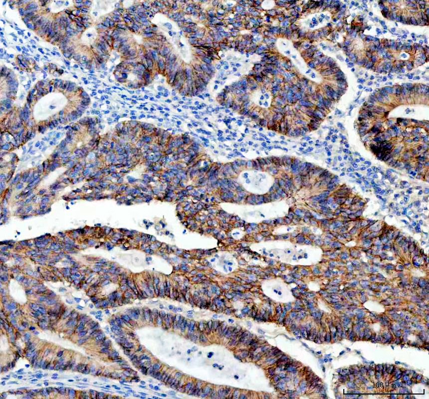 E-cadherin/CDH1 was detected in a paraffin-embedded section of human colorectal adenocarcinoma tissue. The tissue section was incubated with mouse anti-E-cadherin/CDH1 Antibody (M00063-2) at a dilution of 1:200 and developed using HRP Conjugated mouse IgG Super Vision Assay Kit (Catalog # SV0001) with DAB (Catalog # AR1027) as the chromogen.