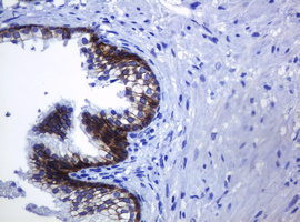 Immunohistochemical staining of paraffin-embedded Human prostate tissue within the normal limits using anti-CDH1 mouse monoclonal antibody. (Heat-induced epitope retrieval by 10mM citric buffer, pH6.0, 120°C for 3min, M00063-5)