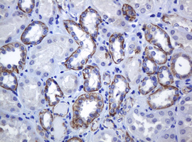 Immunohistochemical staining of paraffin-embedded Human Kidney tissue within the normal limits using anti-CDH1 mouse monoclonal antibody. (Heat-induced epitope retrieval by 10mM citric buffer, pH6.0, 120°C for 3min, M00063-5)