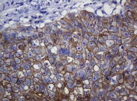 Immunohistochemical staining of paraffin-embedded Carcinoma of Human lung tissue using anti-CDH1 mouse monoclonal antibody. (Heat-induced epitope retrieval by 10mM citric buffer, pH6.0, 120°C for 3min, M00063-5)