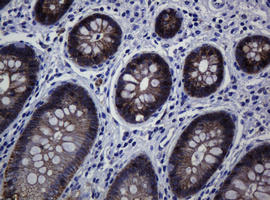 Immunohistochemical staining of paraffin-embedded Human colon tissue within the normal limits using anti-CDH1 mouse monoclonal antibody. (Heat-induced epitope retrieval by 10mM citric buffer, pH6.0, 120°C for 3min, M00063-5)