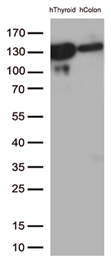 Western blot analysis of extracts (35ug) from 2 tissue lysates by using anti-CDH1 monoclonal antibody (1:500).