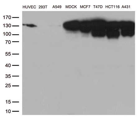 Western blot analysis of extracts (35ug) from 8 cell lines lysates by using anti-CDH1 monoclonal antibody (1:500).