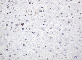Immunohistochemical staining of paraffin-embedded Human liver tissue within the normal limits using anti-PCNA mouse monoclonal antibody. (Heat-induced epitope retrieval by 10mM citric buffer, pH6.0, 120°C for 3min, M00125-4)