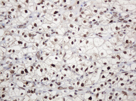 Immunohistochemical staining of paraffin-embedded Carcinoma of Human kidney tissue using anti-PCNA mouse monoclonal antibody. (Heat-induced epitope retrieval by 10mM citric buffer, pH6.0, 120°C for 3min, M00125-4)