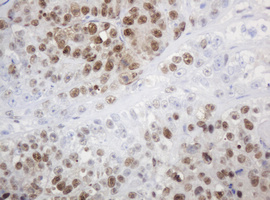 Immunohistochemical staining of paraffin-embedded Carcinoma of Human lung tissue using anti-PCNA mouse monoclonal antibody. (Heat-induced epitope retrieval by 10mM citric buffer, pH6.0, 120°C for 3min, M00125-4)