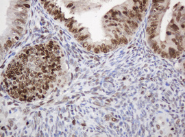 Immunohistochemical staining of paraffin-embedded Adenocarcinoma of Human endometrium tissue using anti-PCNA mouse monoclonal antibody. (Heat-induced epitope retrieval by 10mM citric buffer, pH6.0, 120°C for 3min, M00125-4)