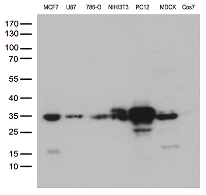Western blot analysis of extracts (35ug) from 4 different cell lines by using anti-CCND1 monoclonal antibody. 1:500