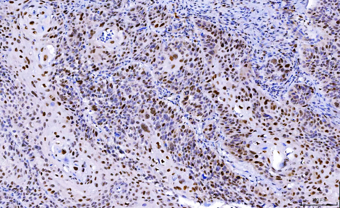 CDK2 was detected in a paraffin-embedded section of human Laryngeal squamous cell carcinomas tissue. Biotinylated goat anti-mouse IgG was used as secondary antibody. The tissue section was incubated with mouse anti-CDK2 Antibody (M00166-3) at a dilution of 1:200 and developed using Strepavidin-Biotin-Complex (SABC) (Catalog # SA1021) with DAB (Catalog # AR1027) as the chromogen.