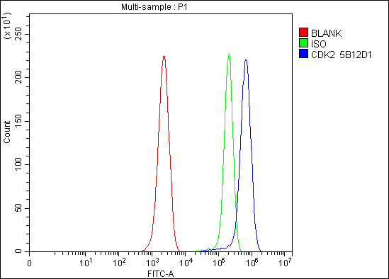 Overlay histogram showing ANA-1 cells stained with M00166-3 (Blue line). To facilitate intracellular staining, cells were fixed with 4% paraformaldehyde and permeabilized with permeabilization buffer. The cells were blocked with 10% normal goat serum. And then incubated with mouse anti-CDK2 Antibody (M00166-3) at 1:100 dilution for 30 min at 20°C. Fluoro488 conjugated goat anti-mouse IgG (BA1126) was used as secondary antibody at 1:100 dilution for 30 minutes at 20°C. Isotype control antibody (Green line) was mouse IgG at 1:100 dilution used under the same conditions. Unlabelled sample without incubation with primary antibody and secondary antibody (Red line) was used as a blank control.