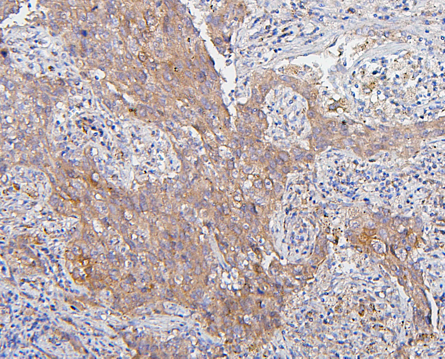 CDK1 was detected in a paraffin-embedded section of human lung cancer tissue. Biotinylated goat anti-mouse IgG was used as secondary antibody. The tissue section was incubated with mouse anti-CDK1 Antibody (M00209-6) at a dilution of 1:200 and developed using Strepavidin-Biotin-Complex (SABC) (Catalog # SA1021) with DAB (Catalog # AR1027) as the chromogen.