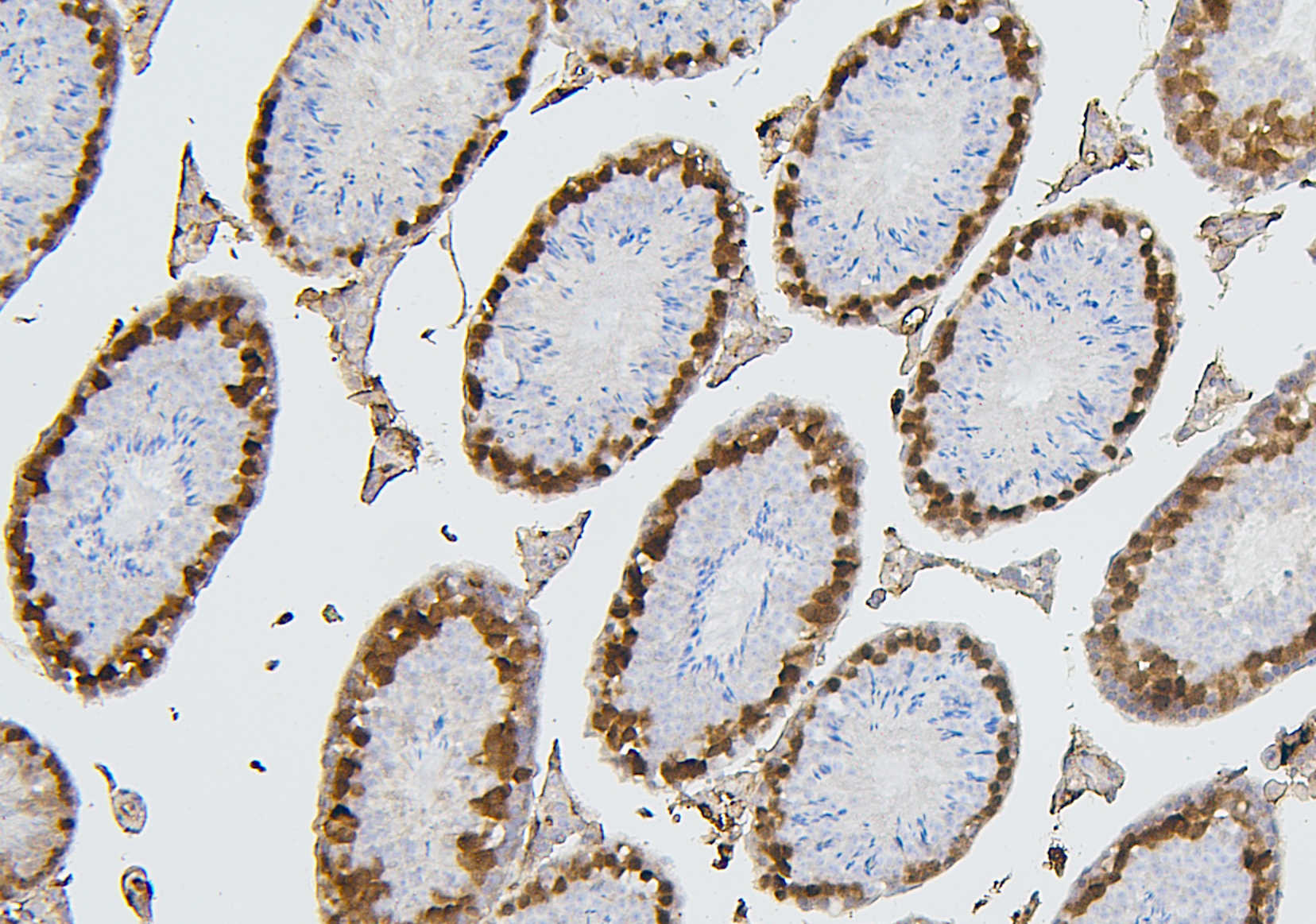 CDK1 was detected in a paraffin-embedded section of mouse testis tissue. Biotinylated goat anti-mouse IgG was used as secondary antibody. The tissue section was incubated with mouse anti-CDK1 Antibody (M00209-6) at a dilution of 1:200 and developed using Strepavidin-Biotin-Complex (SABC) (Catalog # SA1021) with DAB (Catalog # AR1027) as the chromogen.