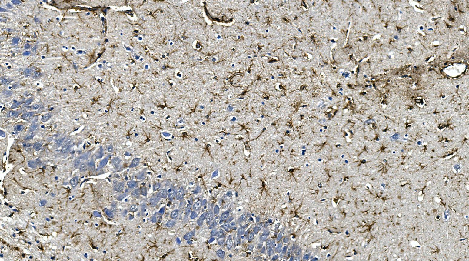 GFAP was detected in a paraffin-embedded section of mouse Hippocampus tissue. Biotinylated goat anti-mouse IgG was used as secondary antibody. The tissue section was incubated with mouse anti-GFAP Antibody (M00213-8) at a dilution of 1:200 and developed using Strepavidin-Biotin-Complex (SABC) (Catalog # SA1021) with DAB (Catalog # AR1027) as the chromogen.