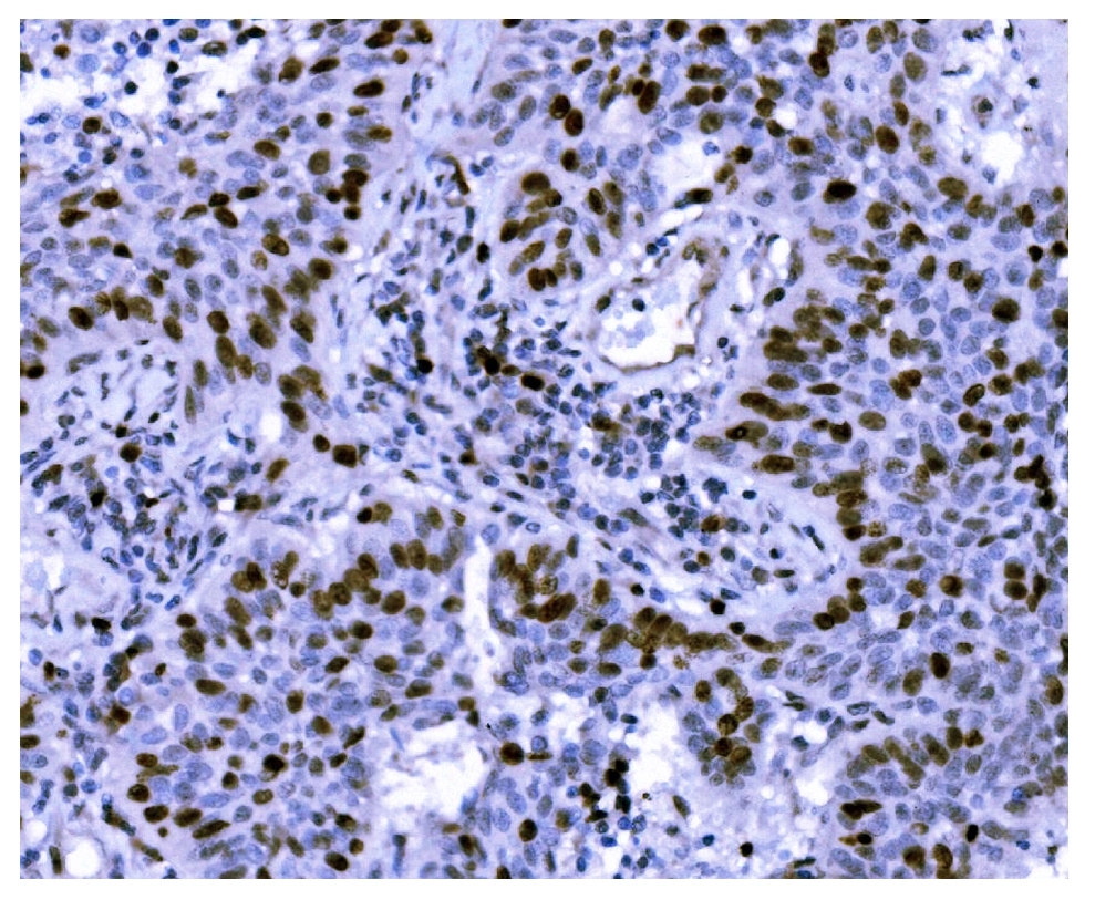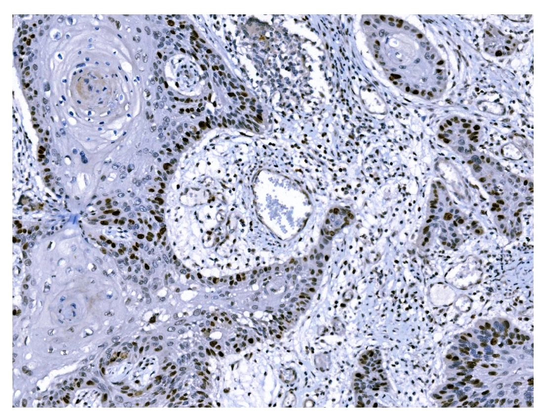 Ki67/MKI67 was detected in a paraffin-embedded section of human esophageal squamous carcinoma tissue. Biotinylated goat anti-mouse IgG was used as secondary antibody. The tissue section was incubated with mouse anti-Ki67/MKI67 Antibody (M00254-9) at a dilution of 1:200 and developed using Strepavidin-Biotin-Complex (SABC) (Catalog # SA1021) with DAB (Catalog # AR1027) as the chromogen.
