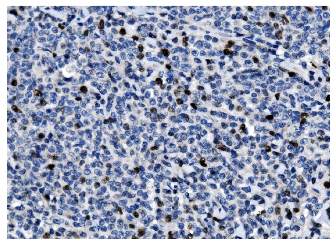 Ki67/MKI67 was detected in a paraffin-embedded section of human lymphomas tissue. Biotinylated goat anti-mouse IgG was used as secondary antibody. The tissue section was incubated with mouse anti-Ki67/MKI67 Antibody (M00254-9) at a dilution of 1:200 and developed using Strepavidin-Biotin-Complex (SABC) (Catalog # SA1021) with DAB (Catalog # AR1027) as the chromogen.