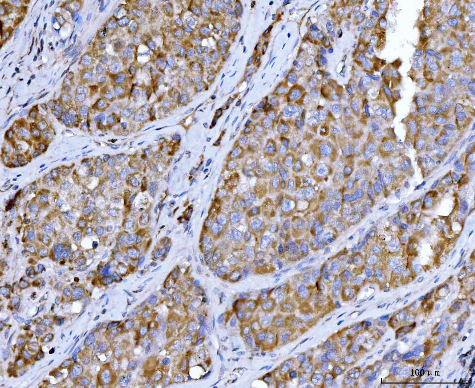 Beclin 1/BECN1 was detected in a paraffin-embedded section of human hepatocellular carcinoma tissue. The tissue section was incubated with mouse anti-Beclin 1/BECN1 Antibody (M00327-2) at a dilution of 1:200 and developed using HRP Conjugated mouse IgG Super Vision Assay Kit (Catalog # SV0001) with DAB (Catalog # AR1027) as the chromogen.