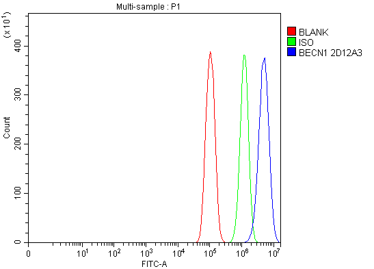 Overlay histogram showing PC-3 cells stained with M00327-2 (Blue line). To facilitate intracellular staining, cells were fixed with 4% paraformaldehyde and permeabilized with permeabilization buffer. The cells were blocked with 10% normal goat serum. And then incubated with mouse anti-Beclin 1/BECN1 Antibody (M00327-2) at 1:100 dilution for 30 min at 20°C. Fluoro488 conjugated goat anti-mouse IgG (BA1126) was used as secondary antibody at 1:100 dilution for 30 minutes at 20°C. Isotype control antibody (Green line) was mouse IgG at 1:100 dilution used under the same conditions. Unlabelled sample without incubation with primary antibody and secondary antibody (Red line) was used as a blank control.