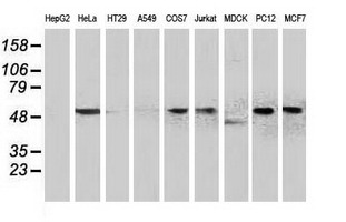 Western blot analysis of extracts (35ug) from 9 different cell lines by using anti-BECN1 monoclonal antibody (HepG2: human; HeLa: human; SVT2: mouse; A549: human; COS7: monkey; Jurkat: human; MDCK: canine; PC12: rat; MCF7: human).