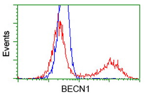 HEK293T cells transfected with either overexpress plasmid (Red) or empty vector control plasmid (Blue) were immunostained by anti-BECN1 antibody, and then analyzed by flow cytometry.