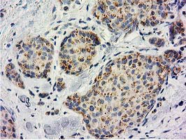 Immunohistochemical staining of paraffin-embedded Adenocarcinoma of Human breast tissue using anti-BECN1 mouse monoclonal antibody. (Heat-induced epitope retrieval by 10mM citric buffer, pH6.0, 100°C for 10min, M00327-3)