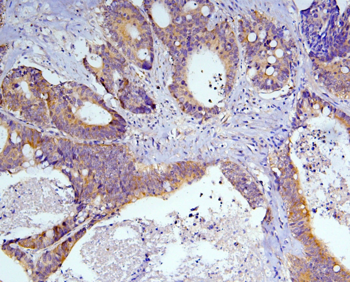 Caspase 3/CASP3 (p17) was detected in a paraffin-embedded section of human intestinal cancer tissue. Biotinylated goat anti-mouse IgG was used as secondary antibody. The tissue section was incubated with mouse anti-Caspase 3/CASP3 (p17) Antibody (M00334-7) at a dilution of 1:200 and developed using Strepavidin-Biotin-Complex (SABC) (Catalog # SA1021) with DAB (Catalog # AR1027) as the chromogen.