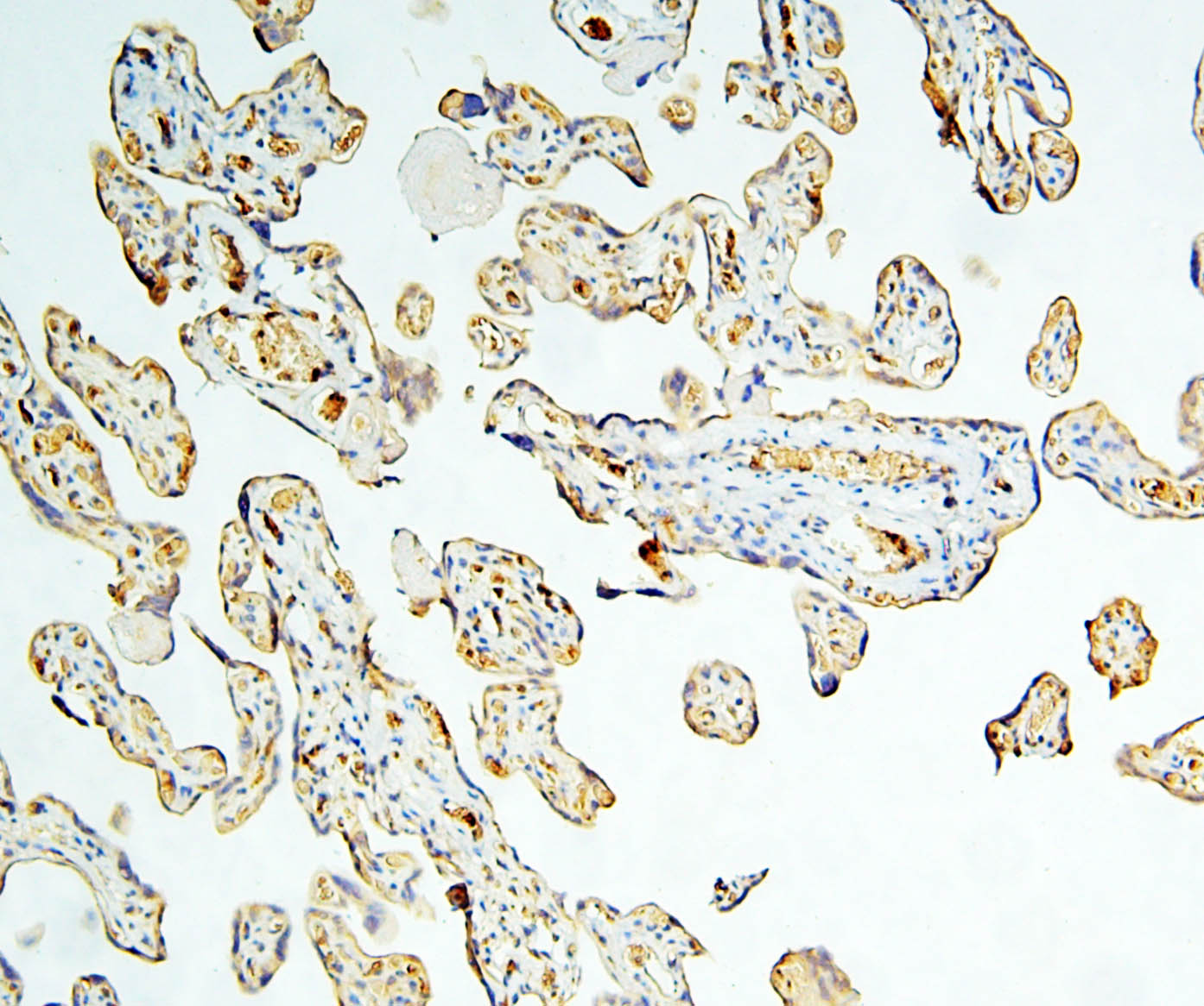 Caspase 3/CASP3 (p17) was detected in a paraffin-embedded section of human placenta tissue. Biotinylated goat anti-mouse IgG was used as secondary antibody. The tissue section was incubated with mouse anti-Caspase 3/CASP3 (p17) Antibody (M00334-7) at a dilution of 1:200 and developed using Strepavidin-Biotin-Complex (SABC) (Catalog # SA1021) with DAB (Catalog # AR1027) as the chromogen.