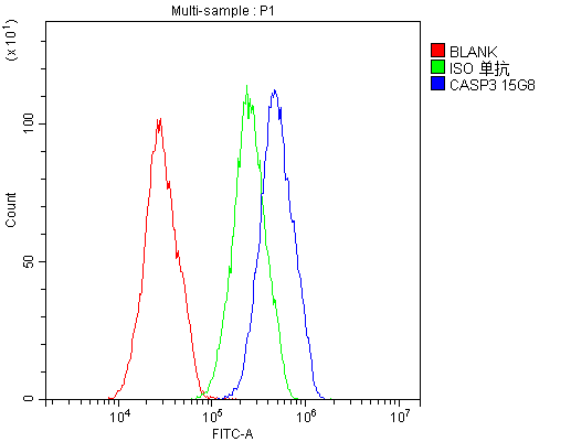 Overlay histogram showing HepG2 cells stained with M00334-7 (Blue line). To facilitate intracellular staining, cells were fixed with 4% paraformaldehyde and permeabilized with permeabilization buffer. The cells were blocked with 10% normal goat serum. And then incubated with mouse anti-Caspase 3/CASP3 (p17) Antibody (M00334-7) at 1:100 dilution for 30 min at 20°C. Fluoro488 conjugated goat anti-mouse IgG (BA1126) was used as secondary antibody at 1:100 dilution for 30 minutes at 20°C. Isotype control antibody (Green line) was mouse IgG at 1:100 dilution used under the same conditions. Unlabelled sample without incubation with primary antibody and secondary antibody (Red line) was used as a blank control.
