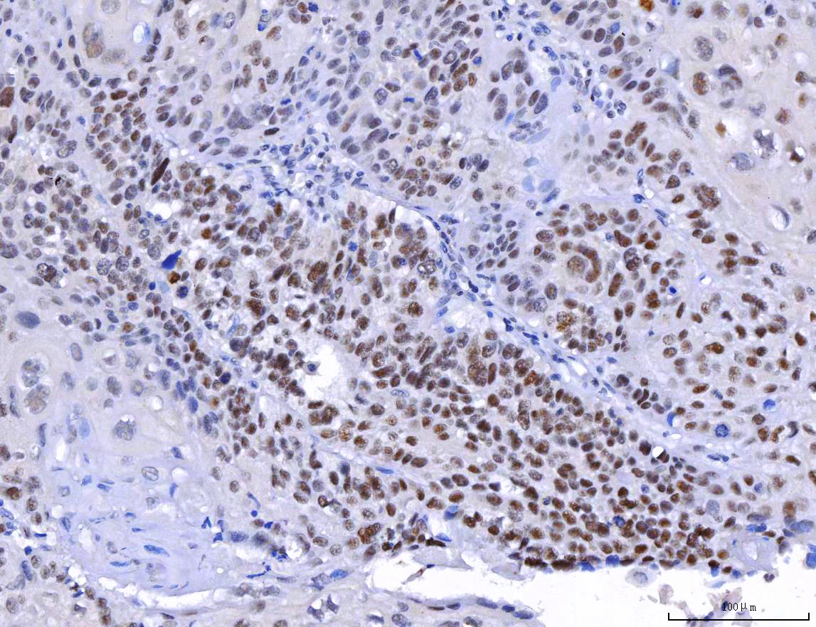 YY1 was detected in a paraffin-embedded section of human Laryngeal squamous cell carcinomas tissue. Biotinylated goat anti-mouse IgG was used as secondary antibody. The tissue section was incubated with mouse anti-YY1 Antibody (M00833-1) at a dilution of 1:200 and developed using Strepavidin-Biotin-Complex (SABC) (Catalog # SA1021) with DAB (Catalog # AR1027) as the chromogen.