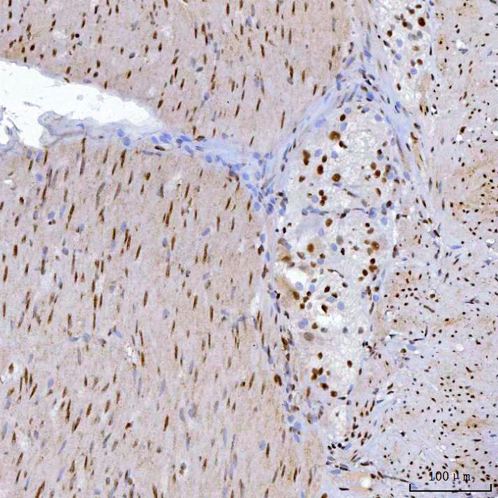 YY1 was detected in a paraffin-embedded section of muscular layer of a colonic adenocarcinoma tissue. Biotinylated goat anti-mouse IgG was used as secondary antibody. The tissue section was incubated with mouse anti-YY1 Antibody (M00833-3) at a dilution of 1:200 and developed using Strepavidin-Biotin-Complex (SABC) (Catalog # SA1021) with DAB (Catalog # AR1027) as the chromogen.