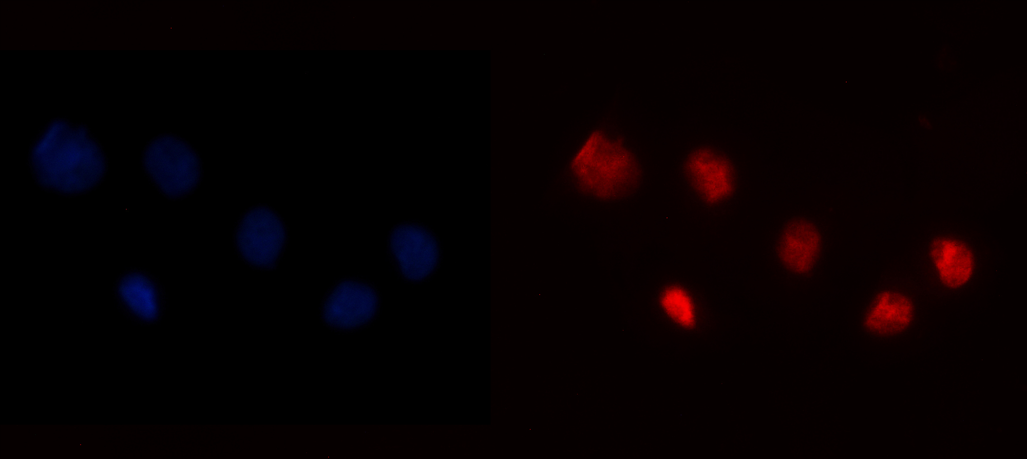 YY1 was detected in an immunocytochemical section of T-47D cells. The section was incubated with mouse anti-YY1 Antibody (M00833-3) at a dilution of 1:100. Fluoro594-conjugated Anti-mouse IgG Secondary Antibody (red)(Catalog#BA1141) was used as secondary antibody. The section was counterstained with DAPI (Catalog # AR1176) (Blue).