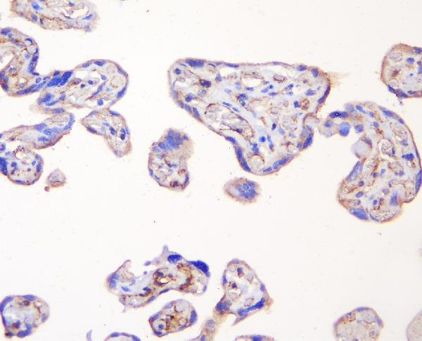 ZO-1/TJP1 was detected in a paraffin-embedded section of human placenta cancer tissue. Biotinylated goat anti-mouse IgG was used as secondary antibody. The tissue section was incubated with mouse anti-ZO-1/TJP1 Antibody (M00860) at a dilution of 1:200 and developed using Strepavidin-Biotin-Complex (SABC) (Catalog # SA1021) with DAB (Catalog # AR1027) as the chromogen.