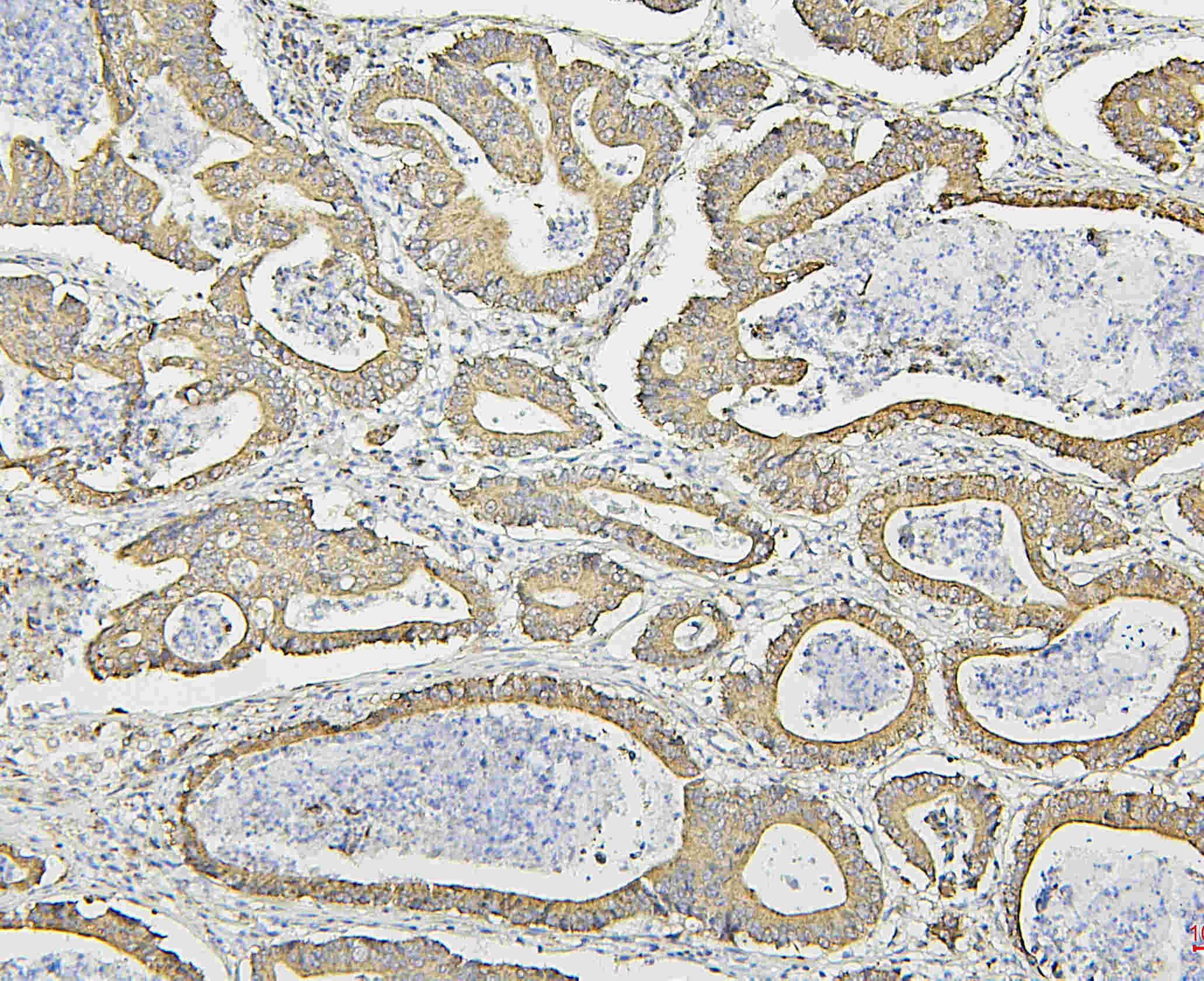 HSP60/HSPD1 was detected in a paraffin-embedded section of human intestinal cancer tissue. Biotinylated goat anti-mouse IgG was used as secondary antibody. The tissue section was incubated with mouse anti-HSP60/HSPD1 Antibody (M01280-3) at a dilution of 1:200 and developed using Strepavidin-Biotin-Complex (SABC) (Catalog # SA1021) with DAB (Catalog # AR1027) as the chromogen.