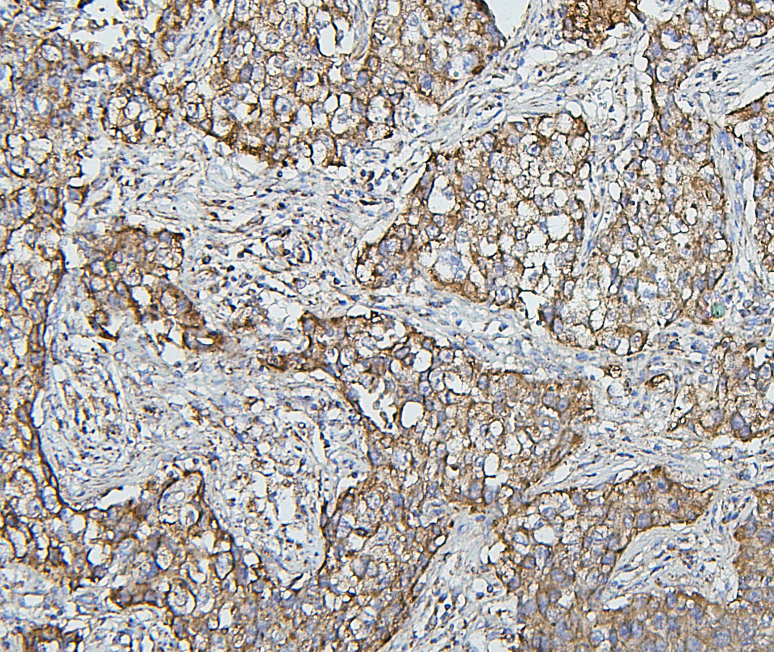 HSP60/HSPD1 was detected in a paraffin-embedded section of human lung cancer tissue. Biotinylated goat anti-mouse IgG was used as secondary antibody. The tissue section was incubated with mouse anti-HSP60/HSPD1 Antibody (M01280-3) at a dilution of 1:200 and developed using Strepavidin-Biotin-Complex (SABC) (Catalog # SA1021) with DAB (Catalog # AR1027) as the chromogen.