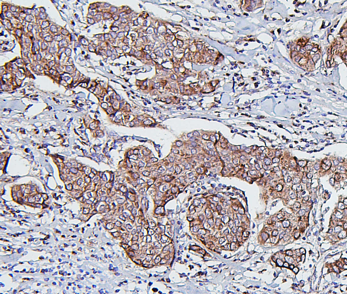 HSP60/HSPD1 was detected in a paraffin-embedded section of human mammary cancer tissue. Biotinylated goat anti-mouse IgG was used as secondary antibody. The tissue section was incubated with mouse anti-HSP60/HSPD1 Antibody (M01280-3) at a dilution of 1:200 and developed using Strepavidin-Biotin-Complex (SABC) (Catalog # SA1021) with DAB (Catalog # AR1027) as the chromogen.