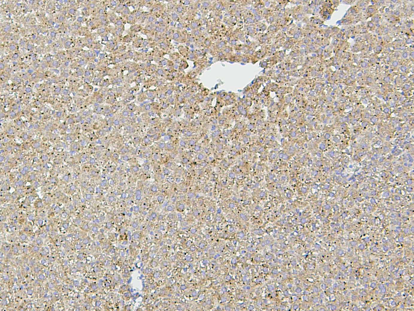 HSP60/HSPD1 was detected in a paraffin-embedded section of rat liver tissue. Biotinylated goat anti-mouse IgG was used as secondary antibody. The tissue section was incubated with mouse anti-HSP60/HSPD1 Antibody (M01280-3) at a dilution of 1:200 and developed using Strepavidin-Biotin-Complex (SABC) (Catalog # SA1021) with DAB (Catalog # AR1027) as the chromogen.