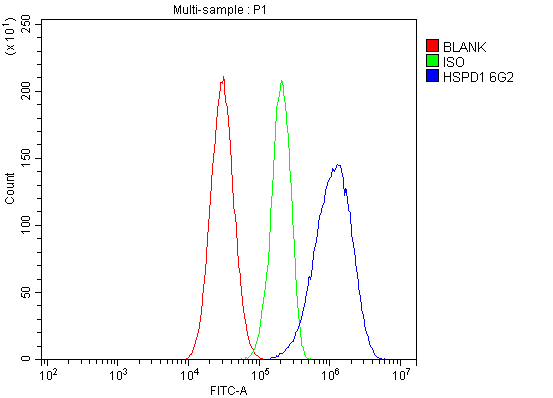 Overlay histogram showing A431 cells stained with M01280-3 (Blue line). To facilitate intracellular staining, cells were fixed with 4% paraformaldehyde and permeabilized with permeabilization buffer. The cells were blocked with 10% normal goat serum. And then incubated with mouse anti-HSP60/HSPD1 Antibody (M01280-3) at 1:100 dilution for 30 min at 20°C. Fluoro488 conjugated goat anti-mouse IgG (BA1126) was used as secondary antibody at 1:100 dilution for 30 minutes at 20°C. Isotype control antibody (Green line) was mouse IgG at 1:100 dilution used under the same conditions. Unlabelled sample without incubation with primary antibody and secondary antibody (Red line) was used as a blank control.