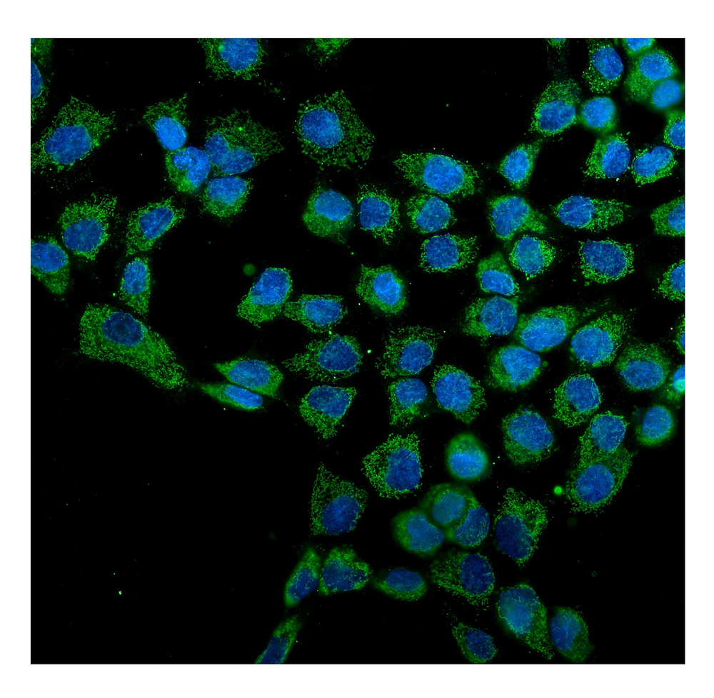 HSP60/HSPD1 was detected in an immunocytochemical section of A431 cells. The section was incubated with mouse anti-HSP60/HSPD1 Antibody (M01280-3) at a dilution of 1:100. Fluoro488-conjugated Anti-mouse IgG Secondary Antibody (green)(Catalog#BA1126) was used as secondary antibody. The section was counterstained with DAPI (Catalog # AR1176) (Blue).