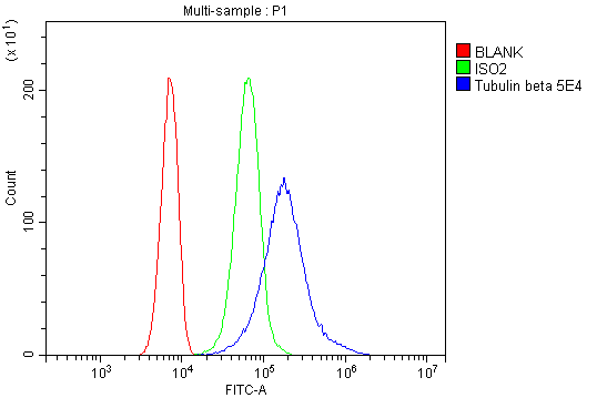 Overlay histogram showing SiHa cells stained with M01857-3 (Blue line). To facilitate intracellular staining, cells were fixed with 4% paraformaldehyde and permeabilized with permeabilization buffer. The cells were blocked with 10% normal goat serum. And then incubated with mouse anti-Beta Tubulin/TUBB Antibody (M01857-3) at 1:100 dilution for 30 min at 20°C. Fluoro488 conjugated goat anti-mouse IgG (BA1126) was used as secondary antibody at 1:100 dilution for 30 minutes at 20°C. Isotype control antibody (Green line) was mouse IgG at 1:100 dilution used under the same conditions. Unlabelled sample without incubation with primary antibody and secondary antibody (Red line) was used as a blank control.