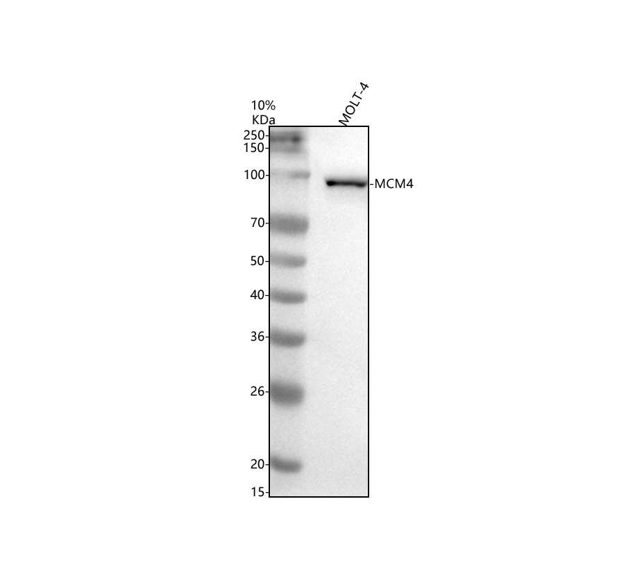 After electrophoresis, proteins were transferred to a membrane. Then the membrane was incubated with rabbit anti-MCM4 antigen affinity purified monoclonal antibody (M02301) at a dilution of 1:1000 and probed with a goat anti-rabbit IgG-HRP secondary antibody (Catalog # BA1054). The signal is developed using ECL Plus Western Blotting Substrate (Catalog # AR1197). A specific band was detected for MCM4 at approximately 97 kDa. The expected band size for MCM4 is at 97 kDa.