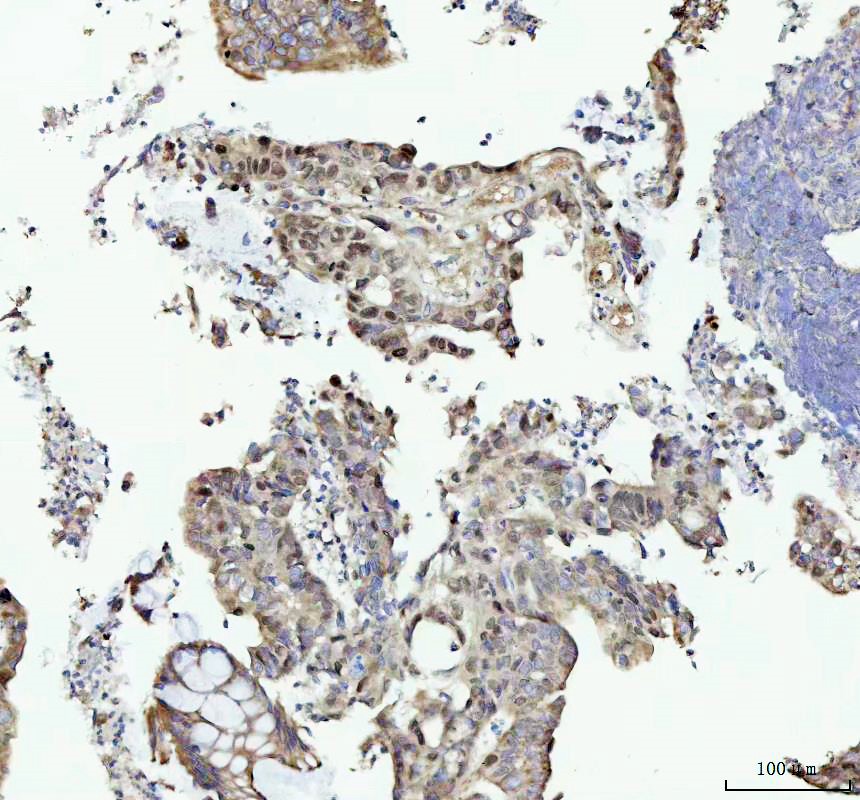 MCM4 was detected in a paraffin-embedded section of human colorectal adenocarcinoma tissue. The tissue section was incubated with rabbit anti-MCM4 Antibody (M02301) at a dilution of 1:200 and developed using HRP Conjugated Rabbit IgG Super Vision Assay Kit (Catalog # SV0002) with DAB (Catalog # AR1027) as the chromogen.