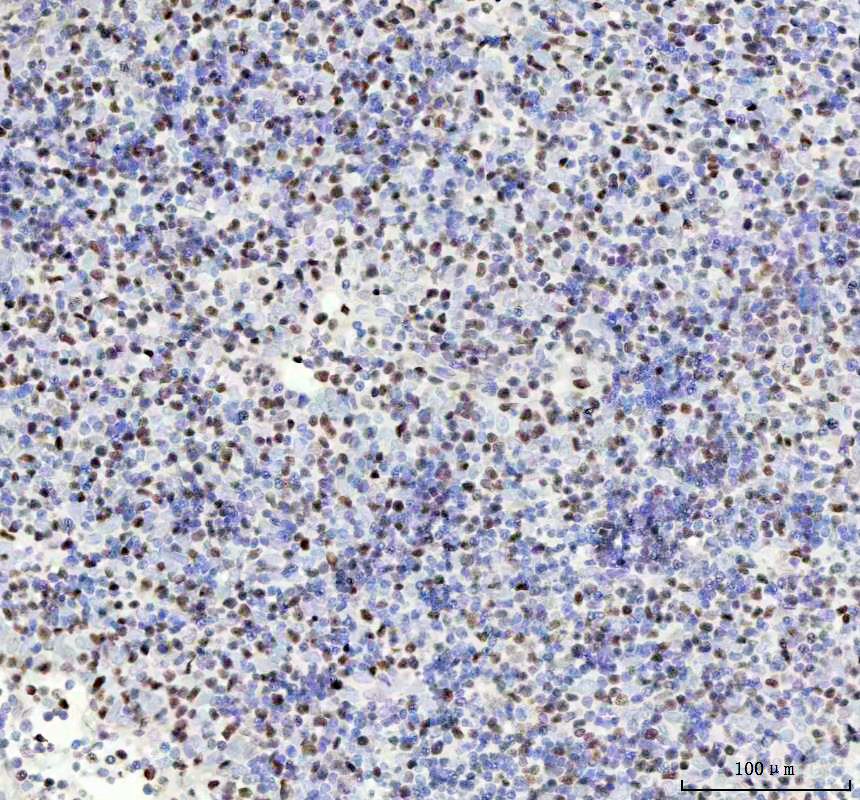 MCM4 was detected in a paraffin-embedded section of human spleen tissue. The tissue section was incubated with rabbit anti-MCM4 Antibody (M02301) at a dilution of 1:200 and developed using HRP Conjugated Rabbit IgG Super Vision Assay Kit (Catalog # SV0002) with DAB (Catalog # AR1027) as the chromogen.