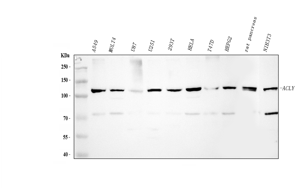 Western blot analysis of ACLY using anti-ACLY antibody (M02372-1). The sample well of each lane was loaded with 30 ug of sample under reducing conditions.