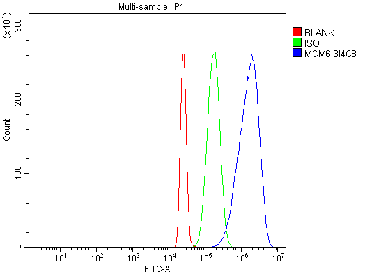 Overlay histogram showing HL-60 cells stained with M02755-1 (Blue line). To facilitate intracellular staining, cells were fixed with 4% paraformaldehyde and permeabilized with permeabilization buffer. The cells were blocked with 10% normal goat serum. And then incubated with mouse anti-MCM6 Antibody (M02755-1) at 1:100 dilution for 30 min at 20°C. Fluoro488 conjugated goat anti-mouse IgG (BA1126) was used as secondary antibody at 1:100 dilution for 30 minutes at 20°C. Isotype control antibody (Green line) was mouse IgG at 1:100 dilution used under the same conditions. Unlabelled sample without incubation with primary antibody and secondary antibody (Red line) was used as a blank control.