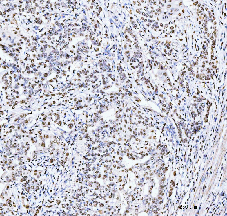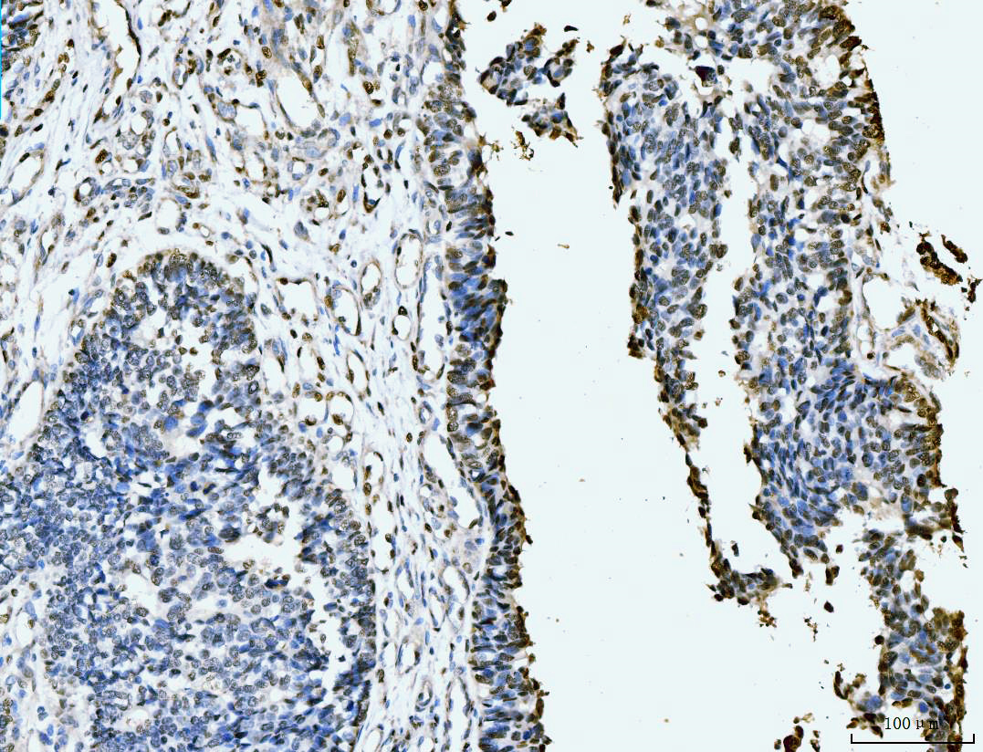 | (Boiling the paraffin sections in 10mM citrate buffer,pH6.0,or PH8.0 EDTA repair liquid for 20 mins is required for the staining of formalin/paraffin sections.) Optimal working dilutions must be determined by end user. | |