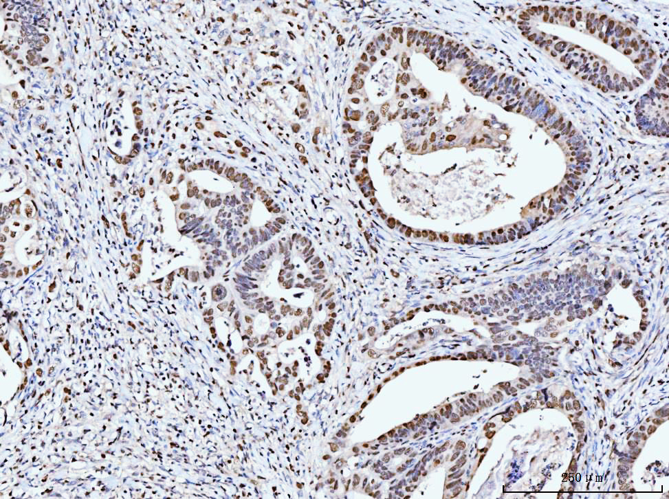 MCM6 was detected in a paraffin-embedded section of human rectal moderately differentiatedadenocarcinoma tissue. Biotinylated goat anti-mouse IgG was used as secondary antibody. The tissue section was incubated with mouse anti-MCM6 Antibody (M02755-1) at a dilution of 1:200 and developed using Strepavidin-Biotin-Complex (SABC) (Catalog # SA1021) with DAB (Catalog # AR1027) as the chromogen.