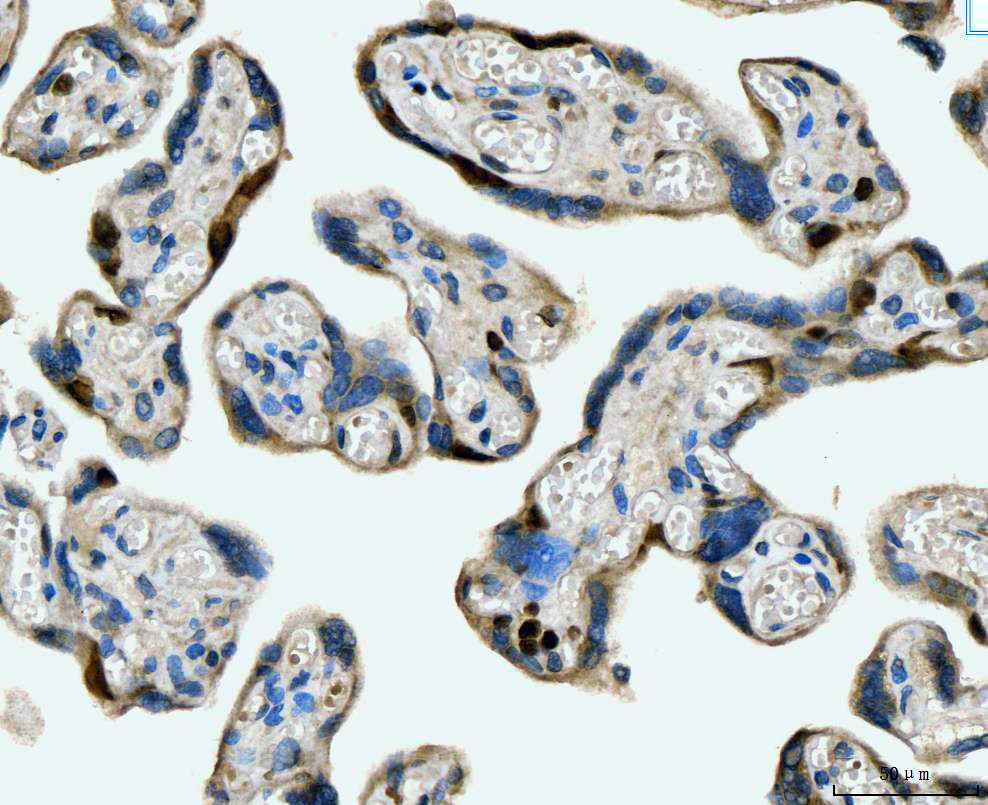 MCM6 was detected in a paraffin-embedded section of human placenta tissue. Biotinylated goat anti-mouse IgG was used as secondary antibody. The tissue section was incubated with mouse anti-MCM6 Antibody (M02755-1) at a dilution of 1:200 and developed using Strepavidin-Biotin-Complex (SABC) (Catalog # SA1021) with DAB (Catalog # AR1027) as the chromogen.