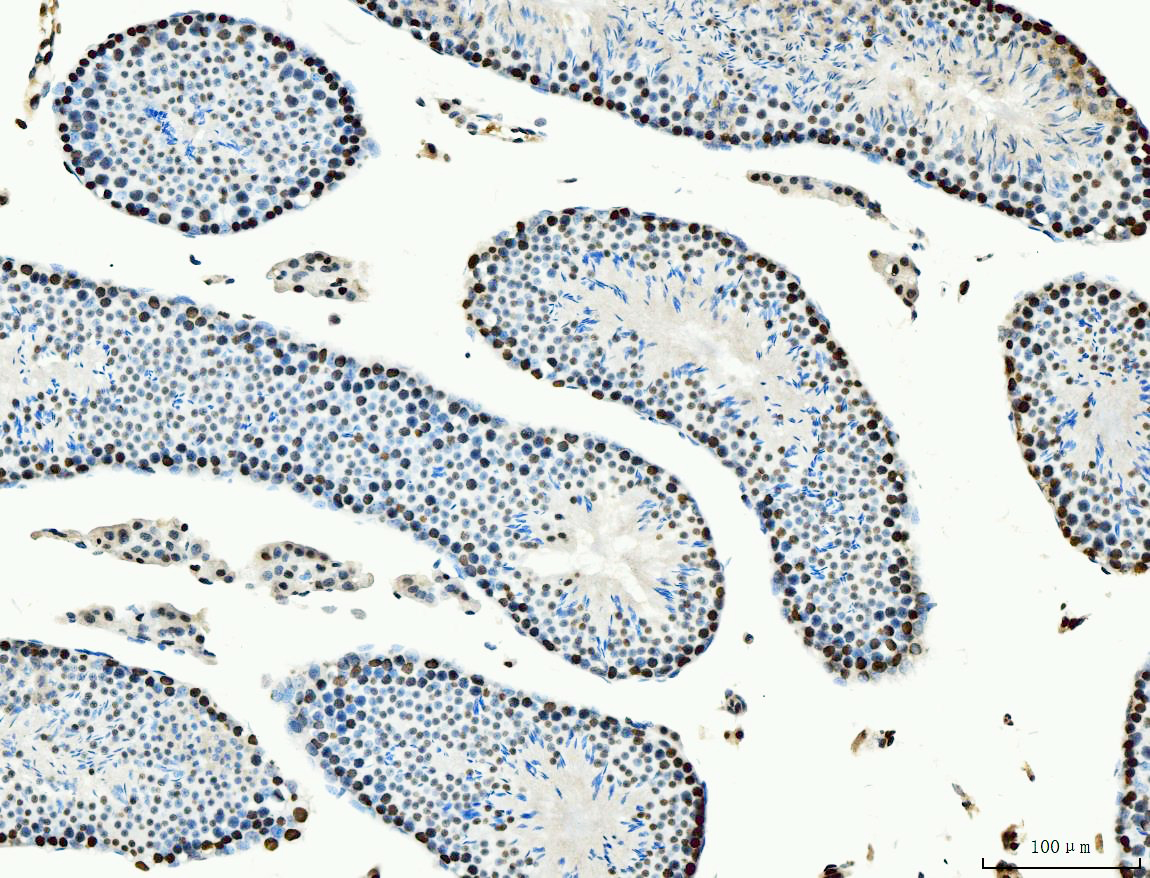 MCM6 was detected in a paraffin-embedded section of mouse testis tissue. Biotinylated goat anti-mouse IgG was used as secondary antibody. The tissue section was incubated with mouse anti-MCM6 Antibody (M02755-1) at a dilution of 1:200 and developed using Strepavidin-Biotin-Complex (SABC) (Catalog # SA1021) with DAB (Catalog # AR1027) as the chromogen.