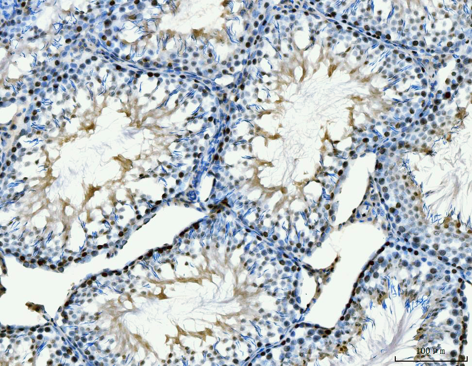 MCM6 was detected in a paraffin-embedded section of rat testis tissue. Biotinylated goat anti-mouse IgG was used as secondary antibody. The tissue section was incubated with mouse anti-MCM6 Antibody (M02755-1) at a dilution of 1:200 and developed using Strepavidin-Biotin-Complex (SABC) (Catalog # SA1021) with DAB (Catalog # AR1027) as the chromogen.