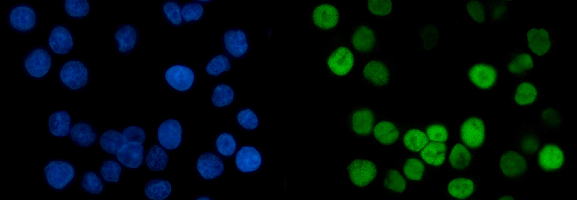 MCM6 was detected in an immunocytochemical section of Caco-2 cells. The section was incubated with mouse anti-MCM6 Antibody (M02755-1) at a dilution of 1:100. Fluoro488-conjugated Anti-mouse IgG Secondary Antibody (green)(Catalog#BA1126) was used as secondary antibody. The section was counterstained with DAPI (Catalog # AR1176) (Blue).