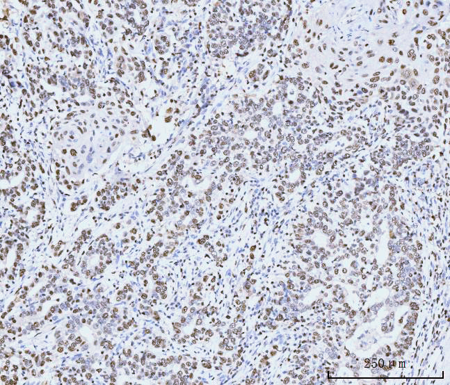 MCM6 was detected in a paraffin-embedded section of human lung cancer tissue. Biotinylated goat anti-mouse IgG was used as secondary antibody. The tissue section was incubated with mouse anti-MCM6 Antibody (M02755-2) at a dilution of 1:200 and developed using Strepavidin-Biotin-Complex (SABC) (Catalog # SA1021) with DAB (Catalog # AR1027) as the chromogen.